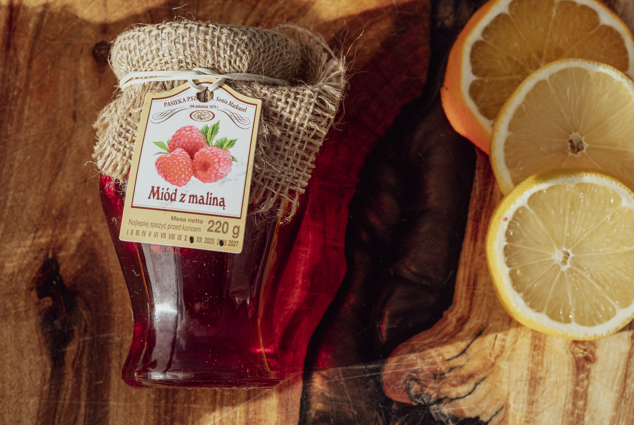 Skład: miód nektarowy wielokwiatowy polski, malina liofilizowana 4%.